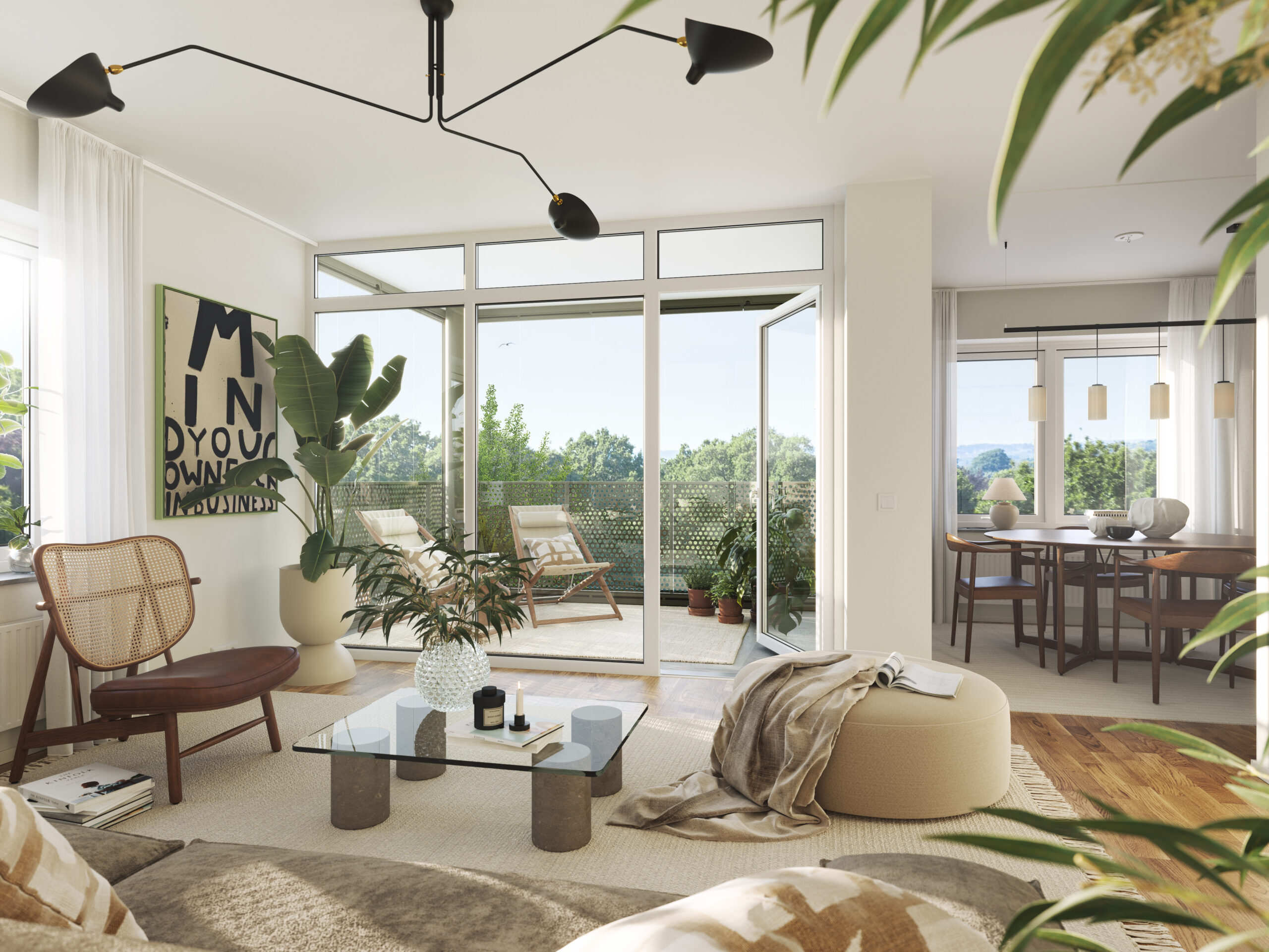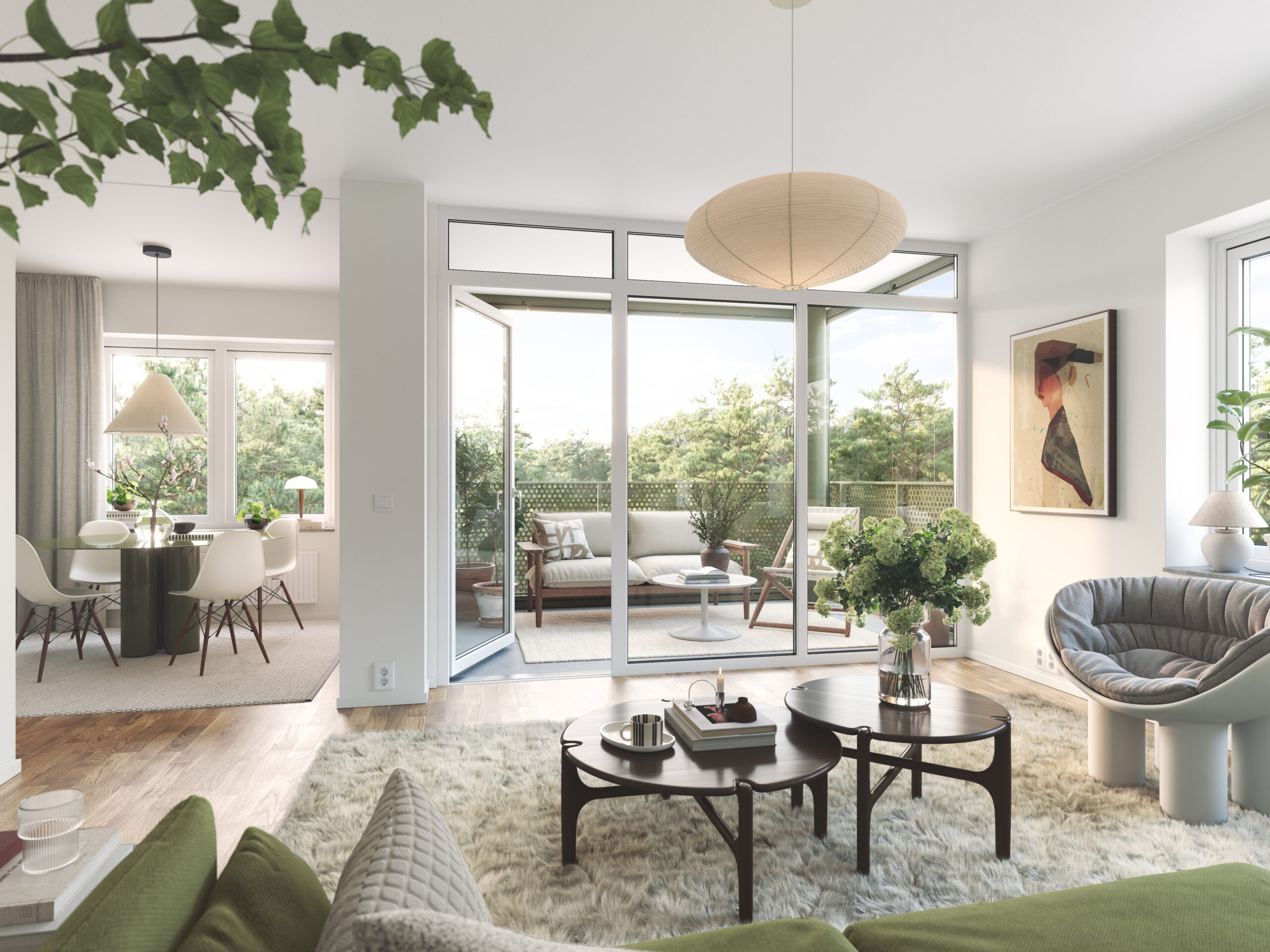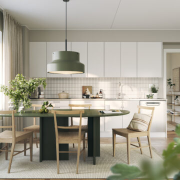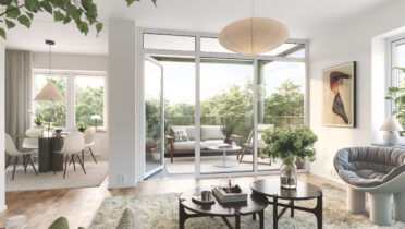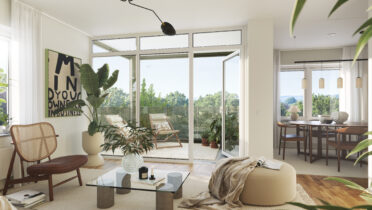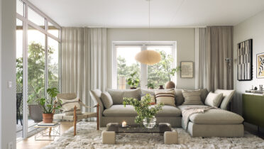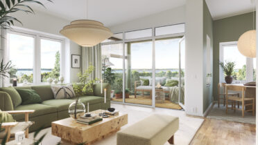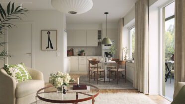 I Brf Björksången är vardagsrummen något alldeles extra. Här möts du av en känsla av rymd och frihet, där den höga takhöjden och de stora fönsterpartierna släpper in dagsljuset och skapar en ljus och harmonisk atmosfär. Vardagsrummet och köket smälter samman i en öppen planlösning som balanserar funktion och estetik på ett stilfullt sätt. Under årets ljusare månader blir den inglasade balkongen en naturlig förlängning av rummet – en plats att koppla av på och njuta av både utsikt och sällskap.