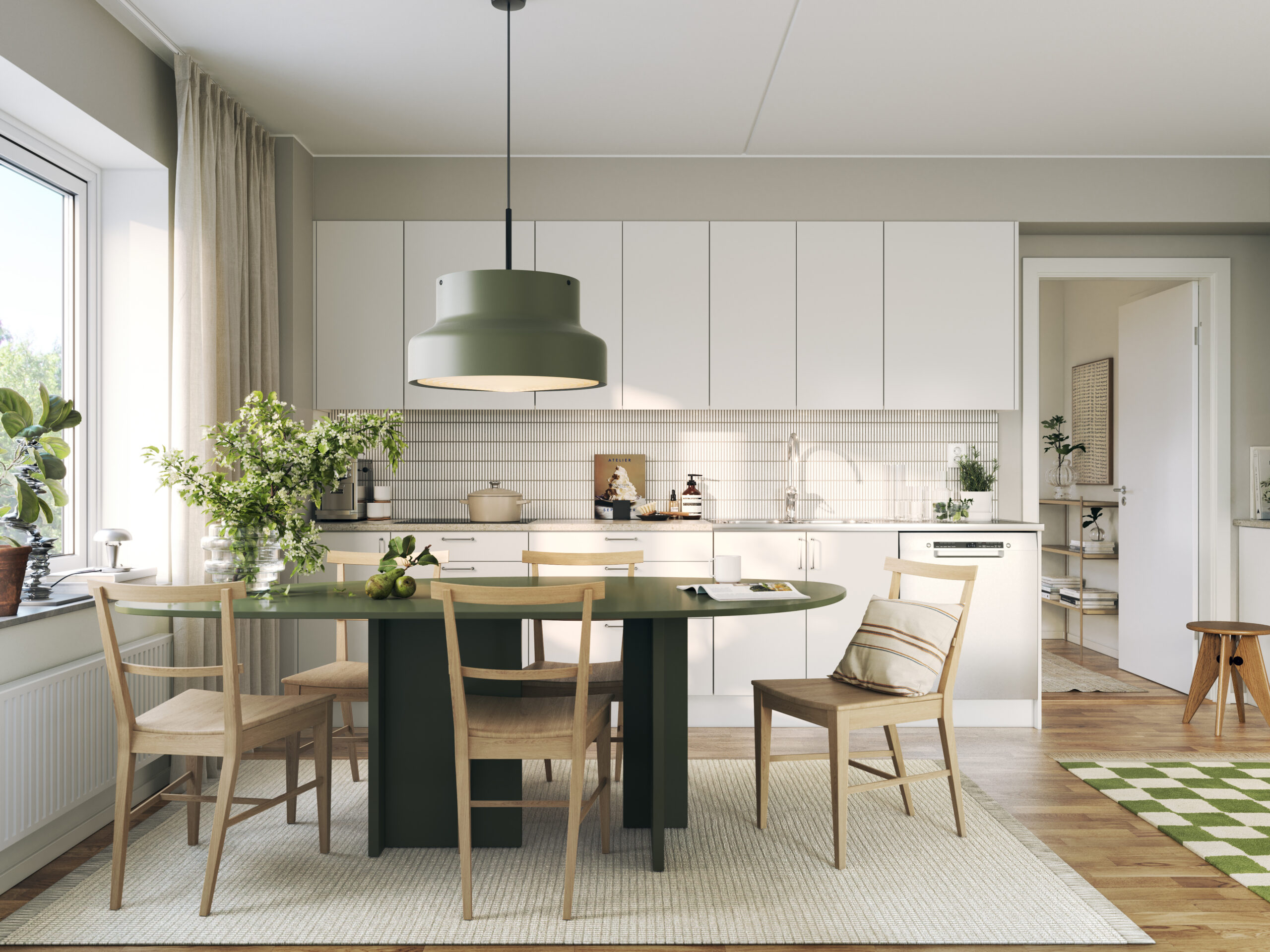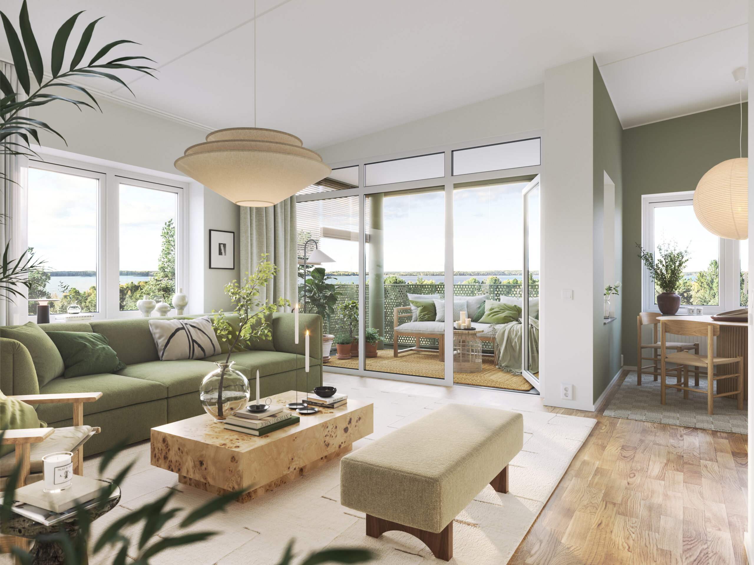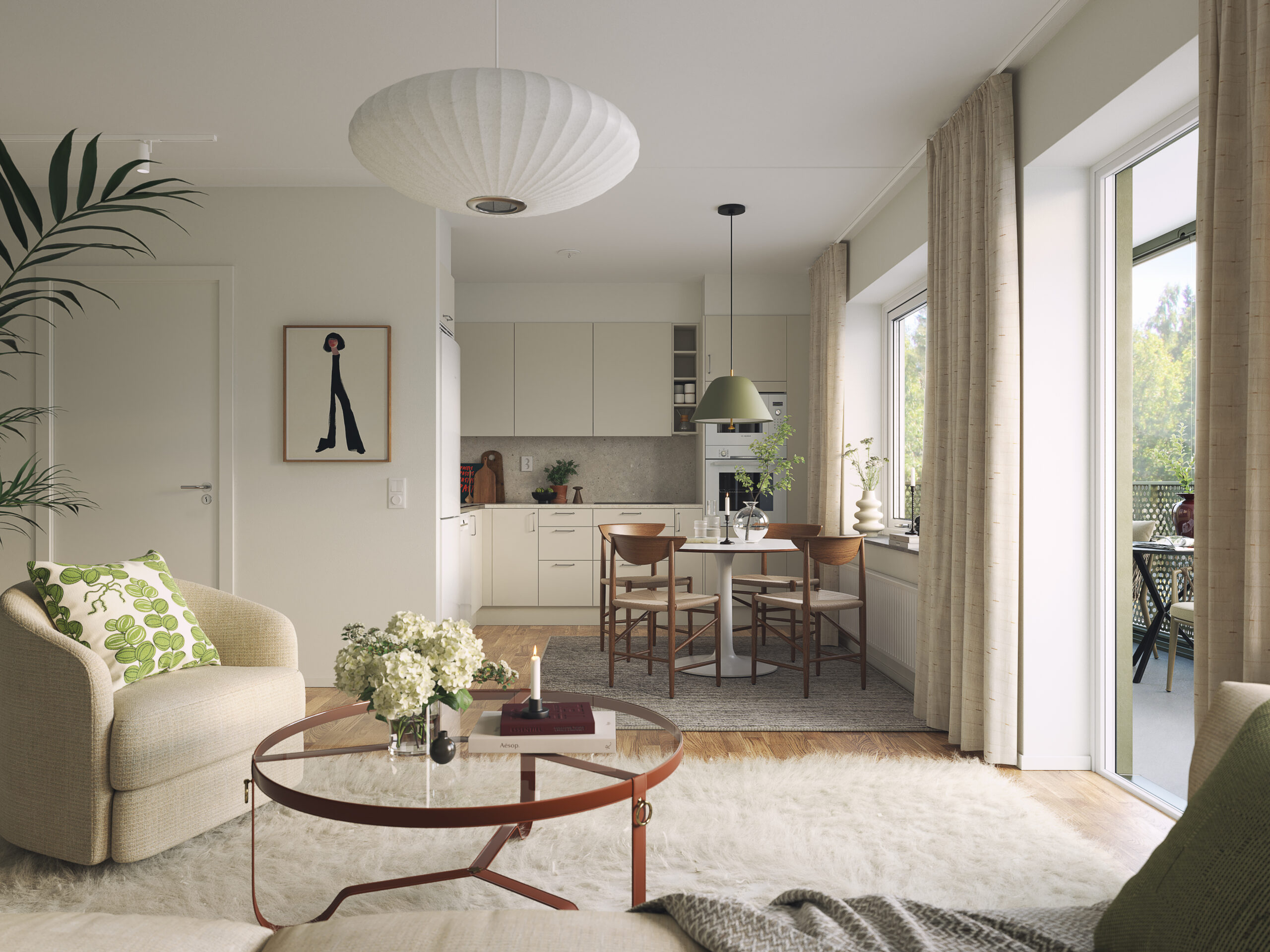 I Brf Björksången är vardagsrummen något alldeles extra. Här möts du av en känsla av rymd och frihet, där den höga takhöjden och de stora fönsterpartierna släpper in dagsljuset och skapar en ljus och harmonisk atmosfär. Vardagsrummet och köket smälter samman i en öppen planlösning som balanserar funktion och estetik på ett stilfullt sätt. Under årets ljusare månader blir den inglasade balkongen en naturlig förlängning av rummet – en plats att koppla av på och njuta av både utsikt och sällskap.