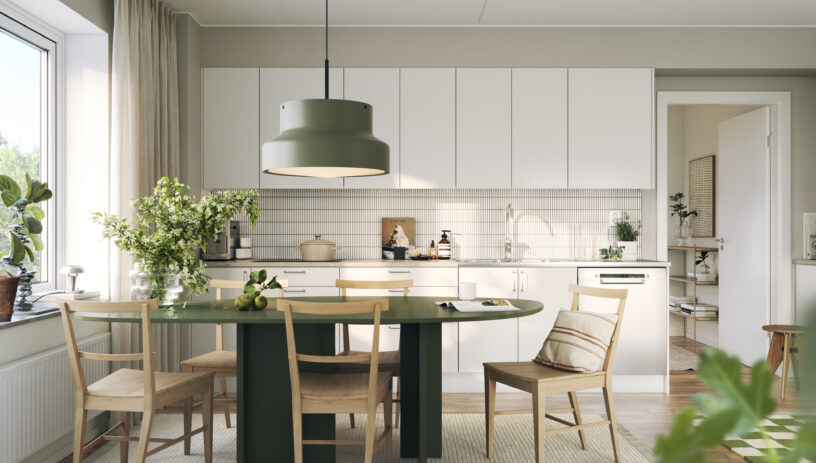 Köket är hemmets hjärta och samlingspunkt för familj, vänner och vardagens alla stunder. Som bas har de välplanerade köken jordnära sandfärgade luckor som tillsammans med bänkskivor och stänkskydd i stilrent val skänker rummet lugn. Standardutrustningen inkluderar vit kyl, frys, diskmaskin, micro och ugn, en klassisk och stilren kombination att anpassa med dina personliga detaljer. Möjlighet finns naturligtvis att välja andra material och rostfria vitvaror, med ett brett utbud av tillval från vår köksleverantör – allt för att skapa just ditt drömkök.