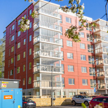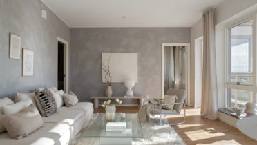 Planlösningen är öppen mellan kök och vardagsrum, det finns gott om plats att välkomna hem till både vardag och fest. Tack vare generös takhöjd och fönsterpartier får rummet en luftig och rymlig känsla. Öppnar man upp ut mot den inglasade balkongen får man ytterligare ett rum att njuta av under årets ljusare delar. När det kommer till förvaring har inget lämnats åt slumpen. Samtliga lägenheter erbjuder både klädkammare och skjutdörrsgarderober och på entréplan finns dessutom ett eget lägenhetsförråd där man enkelt förvarar det man behöver mer sällan.