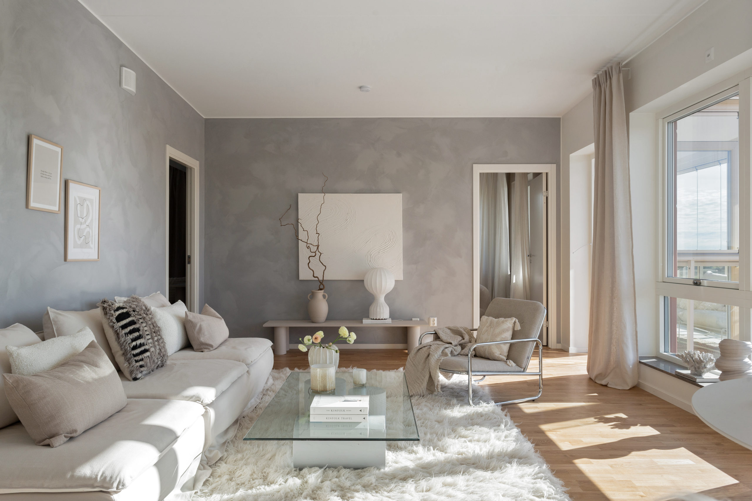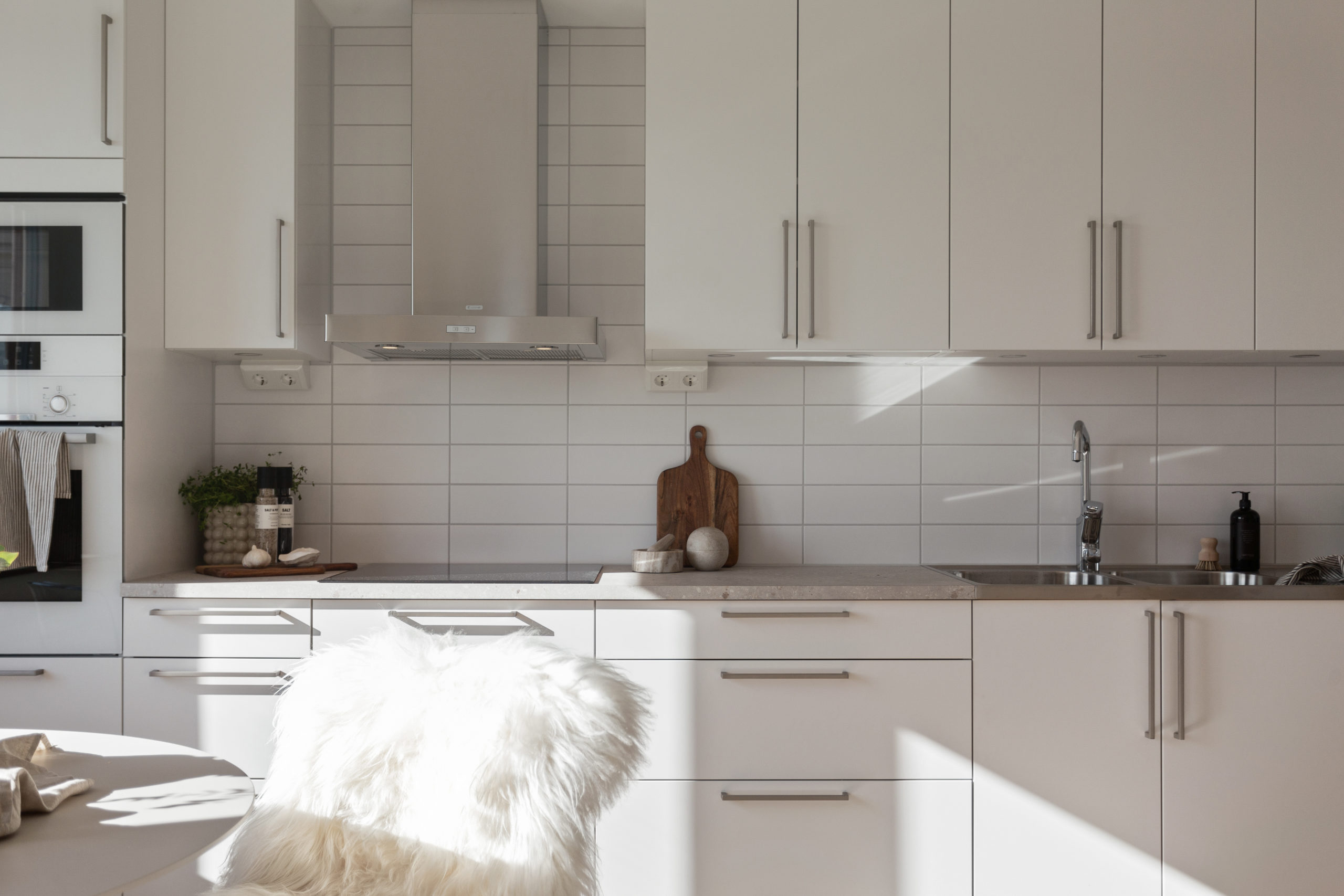 Planlösningen är öppen mellan kök och vardagsrum, det finns gott om plats att välkomna hem till både vardag och fest. Tack vare generös takhöjd och fönsterpartier får rummet en luftig och rymlig känsla. Öppnar man upp ut mot den inglasade balkongen får man ytterligare ett rum att njuta av under årets ljusare delar. När det kommer till förvaring har inget lämnats åt slumpen. Samtliga lägenheter erbjuder både klädkammare och skjutdörrsgarderober och på entréplan finns dessutom ett eget lägenhetsförråd där man enkelt förvarar det man behöver mer sällan.
