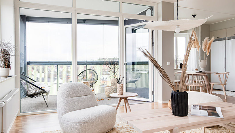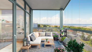 En inglasad balkong finns i merparten av lägenheterna. Ett extra rum att njuta av under årets varma årstider. Här kan du öppna upp luckorna och låta solens värme stråla in men även stänga dem för känslan av att våren kommer lika tidigt som hösten lämnar sent.