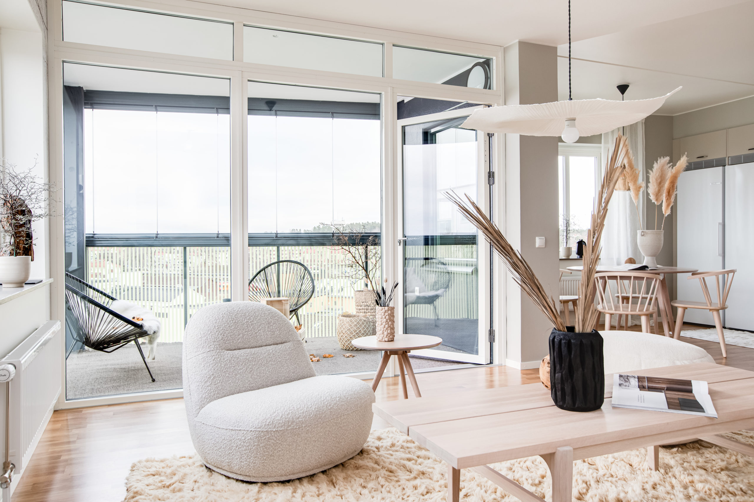 En inglasad balkong finns i merparten av lägenheterna. Ett extra rum att njuta av under årets varma årstider. Här kan du öppna upp luckorna och låta solens värme stråla in men även stänga dem för känslan av att våren kommer lika tidigt som hösten lämnar sent.